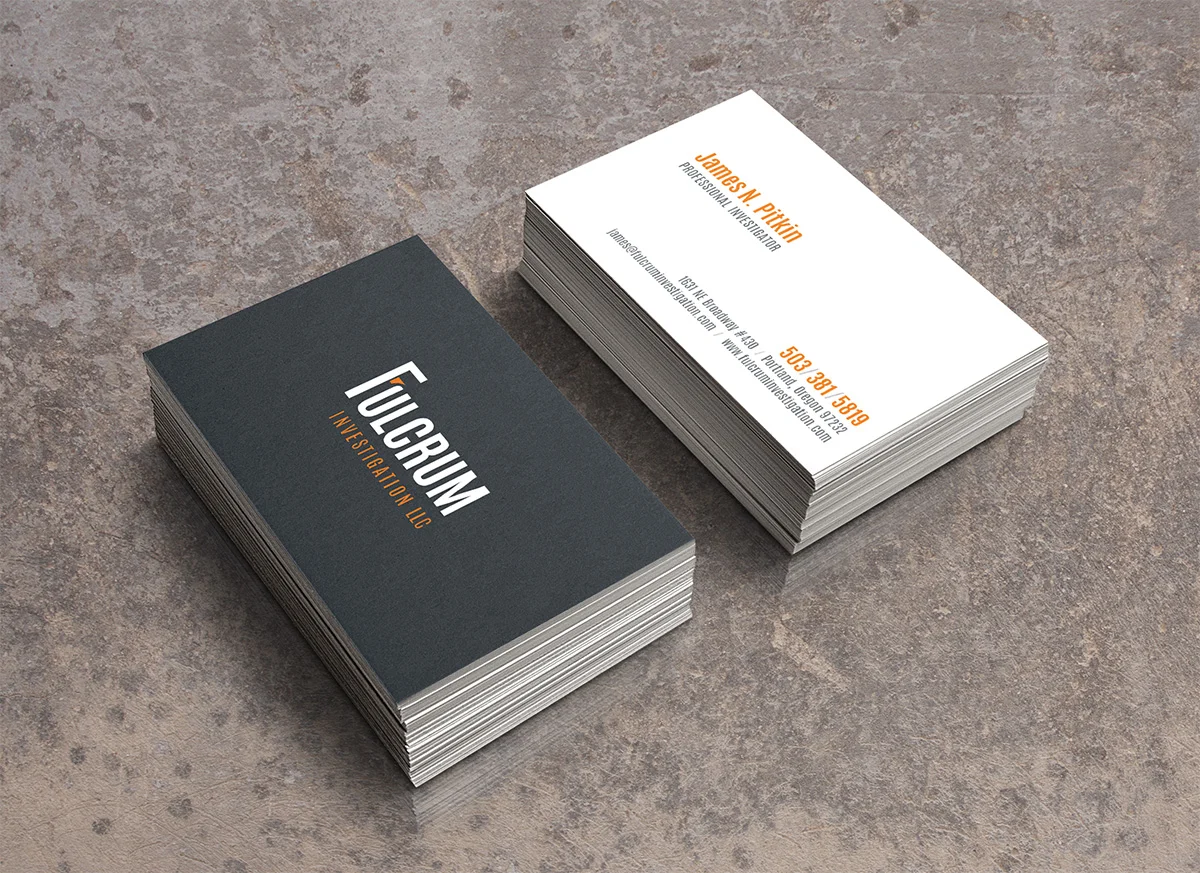Identity design for Fulcrum Investigation included logo mark + lockup, stationary suite and website.